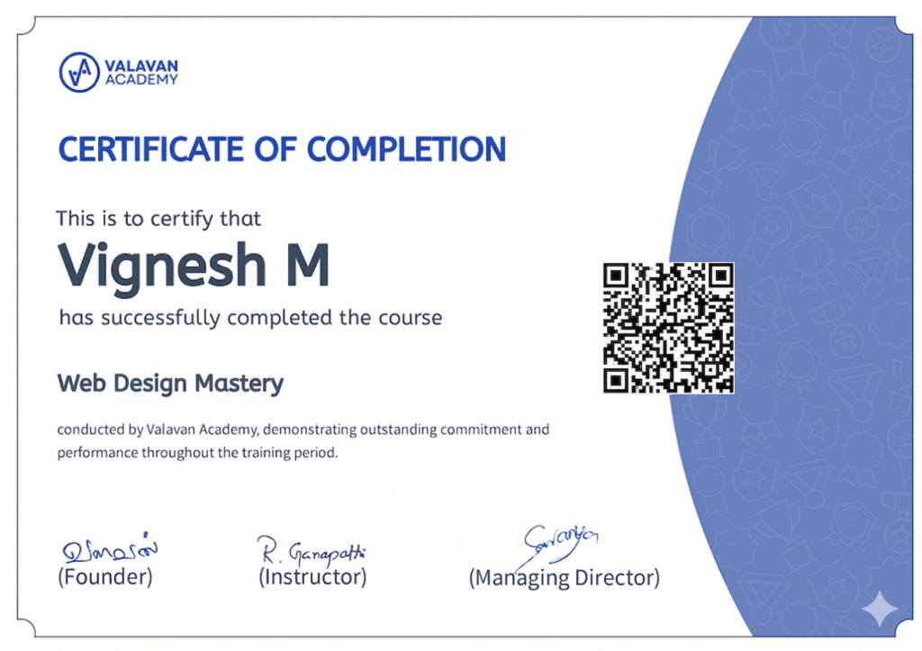 Build stunning, high-performing websites and earn a recognized certification from Valavan Academy. This credential validates your web design and development expertise — helping you stand out to employers, attract clients, and unlock exciting career or freelance opportunities in the world of WordPress.